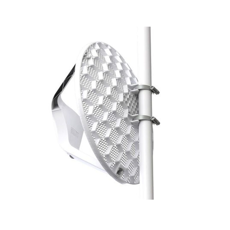 محصول Mikrotik RBLHG-5nD LHG 5 از تجهیزات میکروتیک یک دستگاه وایرلس با قابلیت Access Point برای مراکز اداری کوچک است که از نسل جدید پردازنده Atheros پردازنده: AR9344 با قدرت بیشتر و رم 64 مگابایت طراحی شده است. این آنتن اکسس پوینت با مدل آنتن خارجیOutdoor 24.5dbi که از استاندارد IEEE 802.11a و IEEE 802.11n پشتیبانی می کند را دارا می باشد. همچنین این دستگاه مناسب برای لینکهای PtP و استیشن می باشد. شایان به ذکر است که سرعت انتقال این دستگاه 5GHz-54MBit/s-20dBm و که می تواند به دیگر اکسس پوینت ها متصل گردد. حداکثر جریان بار برروی این پورت 500mA می باشد. رادیو وایرلس میکروتیک LHG 5 یک دستگاه وایرلس کوچک و سبک 5 گیگاهرتزی با استاندارد 802.11a/n و یک آنتن توری دو قطبی (dual polarization 24.5 dBi) یکپارچه با قیمت بسیار مناسبی می باشد. این رادیو برای اتصال های point to point یا برای استفاده به عنوان CPE در مسافت های طولانی ایده آل است و از پروتکل NV2 TDMA پشتیبانی می کند. طراحی توری این رادیو وایرلس محافظت در برابر باد را تضمین می کند. این دستگاه باتوجه به حجم مناسبش حمل آسانی دارد و شامل یک نقطه برای اتصال به زمین برای استفاده مناسب است. همچنین در بسته بندی این رادیو یک آداپتور کوچک برای تغییر جهت آنتن به پنج درجه نسبت به موقعیت اصلی آن قرار دارد.