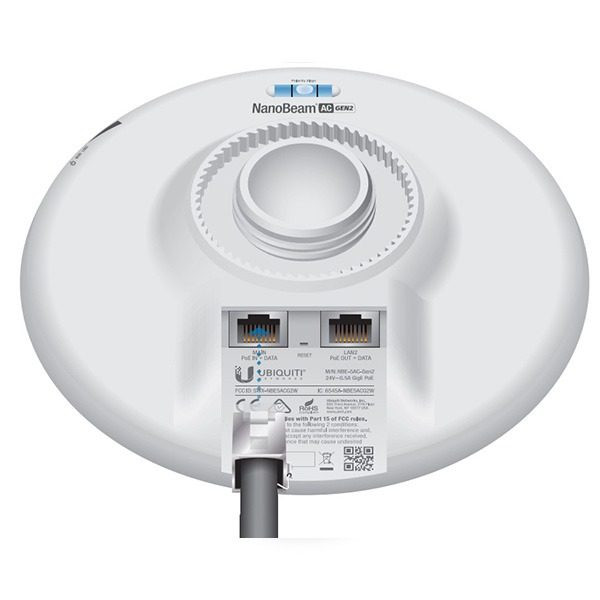 رادیو وایرلس NanoBeam 5AC-Gen2 یوبیکیوتی یکی از محصولات شرکت یو بی کیوتی است که از تکنولوژی های به روز مانند air MAX ac و همچنین محافظت بالا در مقابله با حوادث ESD یا همان تخلیه الکترواستاتیک بهره می برد. این محصول نانوبیم دارای قدرت آنتن 19 dBi و پهنای باند 450Mbps می باشد. استاندارد استفاده شده در این محصول از نوع 802.11a/n/ac تعبیه شده است و توان خروجی این دستگاه 25Dbm معادل 320 میلی وات می باشد که از هر نظر می توان این محصول را به عنوان یک محصول بسیار حرفه ای در رده های بالا در نظر گرفت.